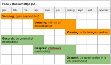 Opgelet: in het schema wordt er uitgegaan van 'jaar 1' en 'jaar 2'. Uiteraard zal dit niet altijd even mooi afgelijnd zijn. Is je medewerker na een jaar nog niet klaar om vooral met de blik naar een volgende uitdaging te kijken, pas het tempo van je traject dan aan in overleg. Is je medewerker anderzijds na enkele maanden al klaar om met het toekomstige jobdoelwit aan de slag te gaan, spreek dan af hoe en in welke mate je hierin als begeleider kan ondersteunen.